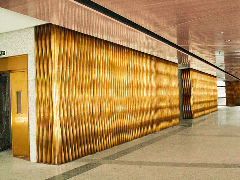 整墻黃銅波紋:讓裝飾成了 “光影互動(dòng)場(chǎng)”墻面延續(xù)了同款銅波紋板,褶皺隨光線、視角變化:白天是泛著柔光的 “金屬織錦”,傍晚燈光亮起時(shí),又成了流動(dòng)的 “鎏金幕布”。銅材的冷硬質(zhì)感,撞上波紋的柔化線條,讓 “裝飾墻” 變成了能與空間對(duì)話的 “藝術(shù)載體”—— 連路過(guò)的人都忍不住停下,看光影在銅紋里 “流動(dòng)”。